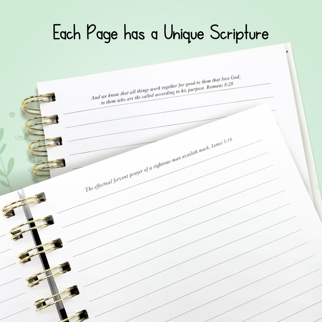 Quality: The pages are high quality, thick paper preventing any ink bleeding through or smudging. Journal is spiral bound, including 128 pages with scripture at the top of every page. Size: 6.25” x 8.5”