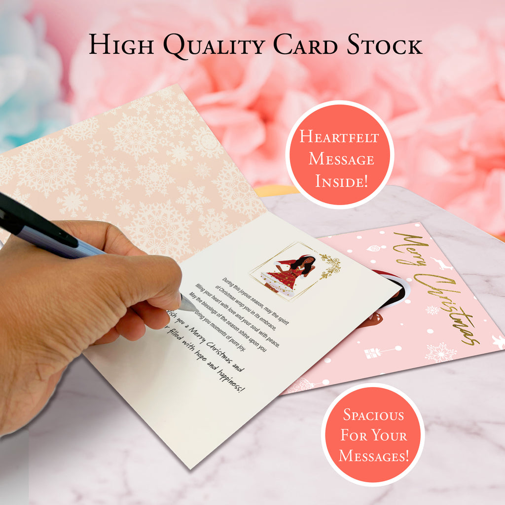 Foil-Stamped Christmas Greeting Cards Box SetAfrican American Expressions Christmas cards celebrate the joy of the holidays and the vibrancy of African-American culture! Our collection of thoughtful seasonal greeting card designs feature faith-inspiring inscriptions and culturally reflective artwork gorgeously embellished with foil-stamping. With over 20 thoughtful designs to choose from, whether timeless, traditional, or modern, you're sure to find the perfect card for everyone on your list!Designed with quality craftsmanship. Every 5 x7" greeting card features a high-resolution image, printed onto sturdy cardstock, and brilliantly embossed. You'll enjoy sharing these elegant and uplifting cards with your loved ones!Holidays, SimplifiedEverything you need to be holiday-ready in one box! AAE's boxed sets include 15 gorgeous greeting cards with coordinating foil-lined envelopes and gold sticker seals. Just personalize, seal, and deliver!FeaturesInspirational Christmas Cards5 x 7"Boxed Set15 Embossed Greeting CardsCoordinating Foil-Lined EnvelopesGold Sticker SealsAbout UsAfrican American Expressions is the world’s largest black-owned gift and greeting-card company. Known for eye-catching designs and poignant art pieces, we offer the top selection of culturally authentic gifts and give back to the community through the AAE fundraising program.