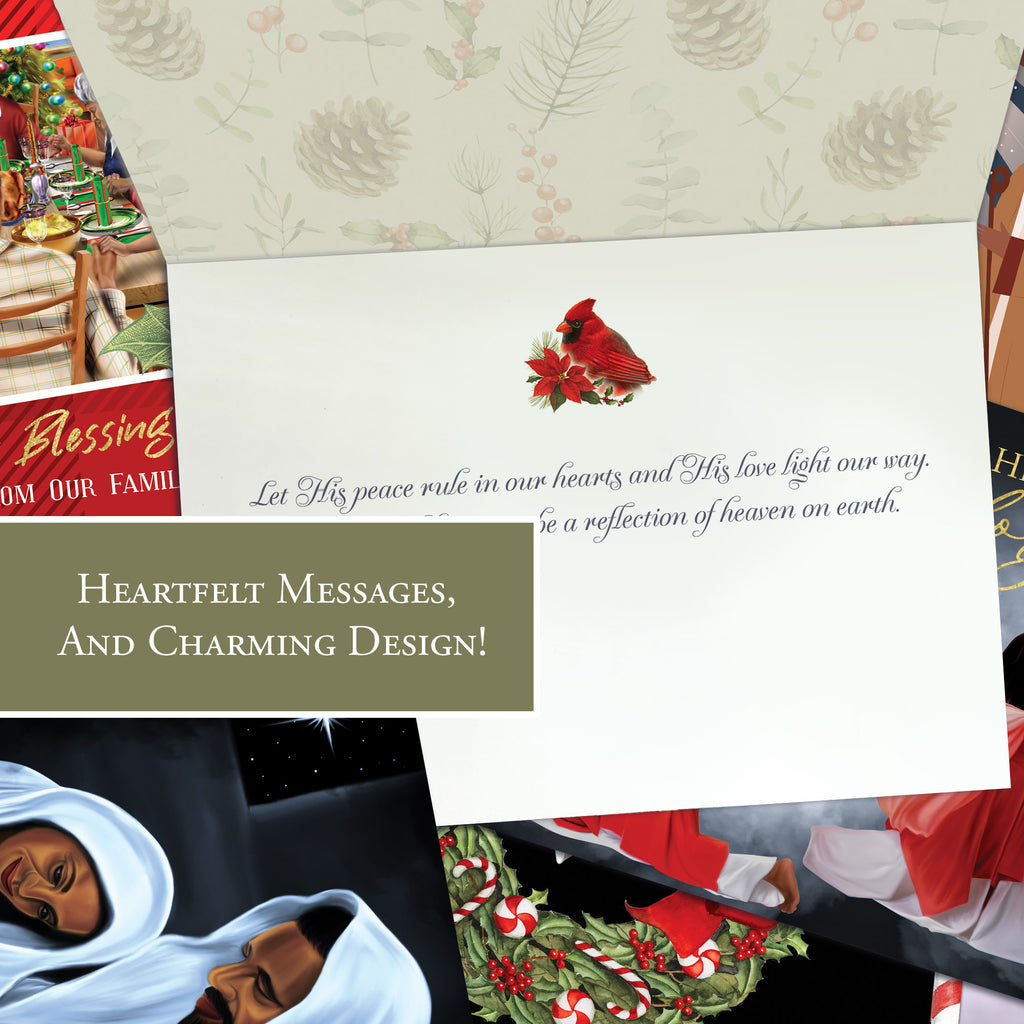 Foil-Stamped Christmas Greeting Cards Box SetAfrican American Expressions Christmas cards celebrate the joy of the holidays and the vibrancy of African-American culture! Our collection of thoughtful seasonal greeting card designs feature faith-inspiring inscriptions and culturally reflective artwork gorgeously embellished with foil-stamping. With over 20 thoughtful designs to choose from, whether timeless, traditional, or modern, you're sure to find the perfect card for everyone on your list!Designed with quality craftsmanship. Every 5 x7" greeting card features a high-resolution image, printed onto sturdy cardstock, and brilliantly embossed. You'll enjoy sharing these elegant and uplifting cards with your loved ones!Holidays, SimplifiedEverything you need to be holiday-ready in one box! AAE's boxed sets include 15 gorgeous greeting cards with coordinating foil-lined envelopes and gold sticker seals. Just personalize, seal, and deliver!FeaturesInspirational Christmas Cards5 x 7"Boxed Set15 Embossed Greeting CardsCoordinating Foil-Lined EnvelopesGold Sticker SealsAbout UsAfrican American Expressions is the world’s largest black-owned gift and greeting-card company. Known for eye-catching designs and poignant art pieces, we offer the top selection of culturally authentic gifts and give back to the community through the AAE fundraising program.