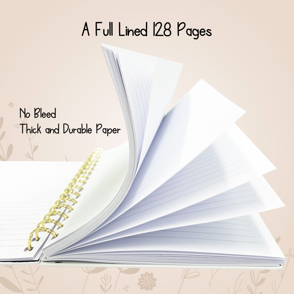Quality: The pages are high quality, thick paper preventing any ink bleeding through or smudging. Journal is spiral bound, including 128 pages with scripture at the top of every page. Size: 6.25” x 8.5”