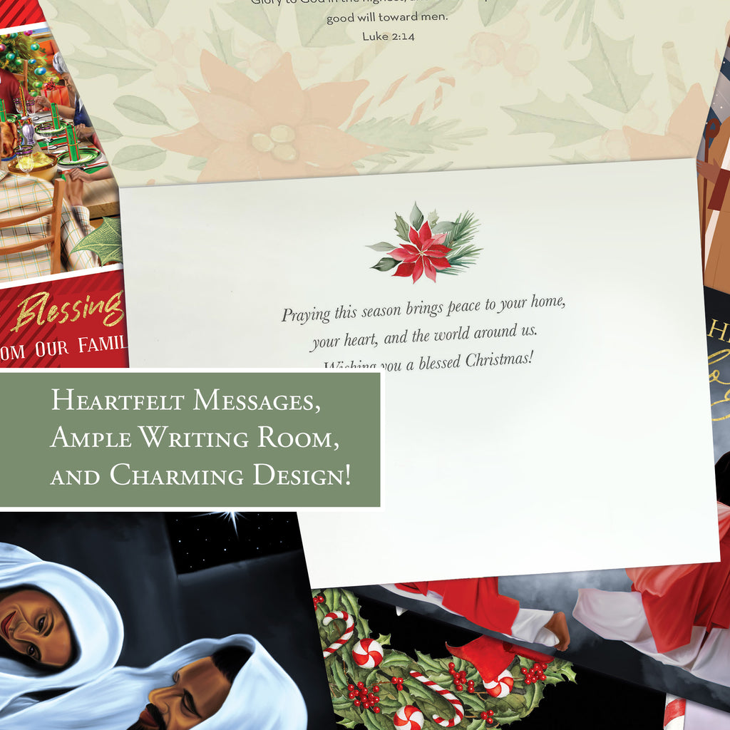 Foil-Stamped Christmas Greeting Cards Box SetAfrican American Expressions Christmas cards celebrate the joy of the holidays and the vibrancy of African-American culture! Our collection of thoughtful seasonal greeting card designs feature faith-inspiring inscriptions and culturally reflective artwork gorgeously embellished with foil-stamping. With over 20 thoughtful designs to choose from, whether timeless, traditional, or modern, you're sure to find the perfect card for everyone on your list!Designed with quality craftsmanship. Every 5 x7" greeting card features a high-resolution image, printed onto sturdy cardstock, and brilliantly embossed. You'll enjoy sharing these elegant and uplifting cards with your loved ones!Holidays, SimplifiedEverything you need to be holiday-ready in one box! AAE's boxed sets include 15 gorgeous greeting cards with coordinating foil-lined envelopes and gold sticker seals. Just personalize, seal, and deliver!FeaturesInspirational Christmas Cards5 x 7"Boxed Set15 Embossed Greeting CardsCoordinating Foil-Lined EnvelopesGold Sticker SealsAbout UsAfrican American Expressions is the world’s largest black-owned gift and greeting-card company. Known for eye-catching designs and poignant art pieces, we offer the top selection of culturally authentic gifts and give back to the community through the AAE fundraising program.