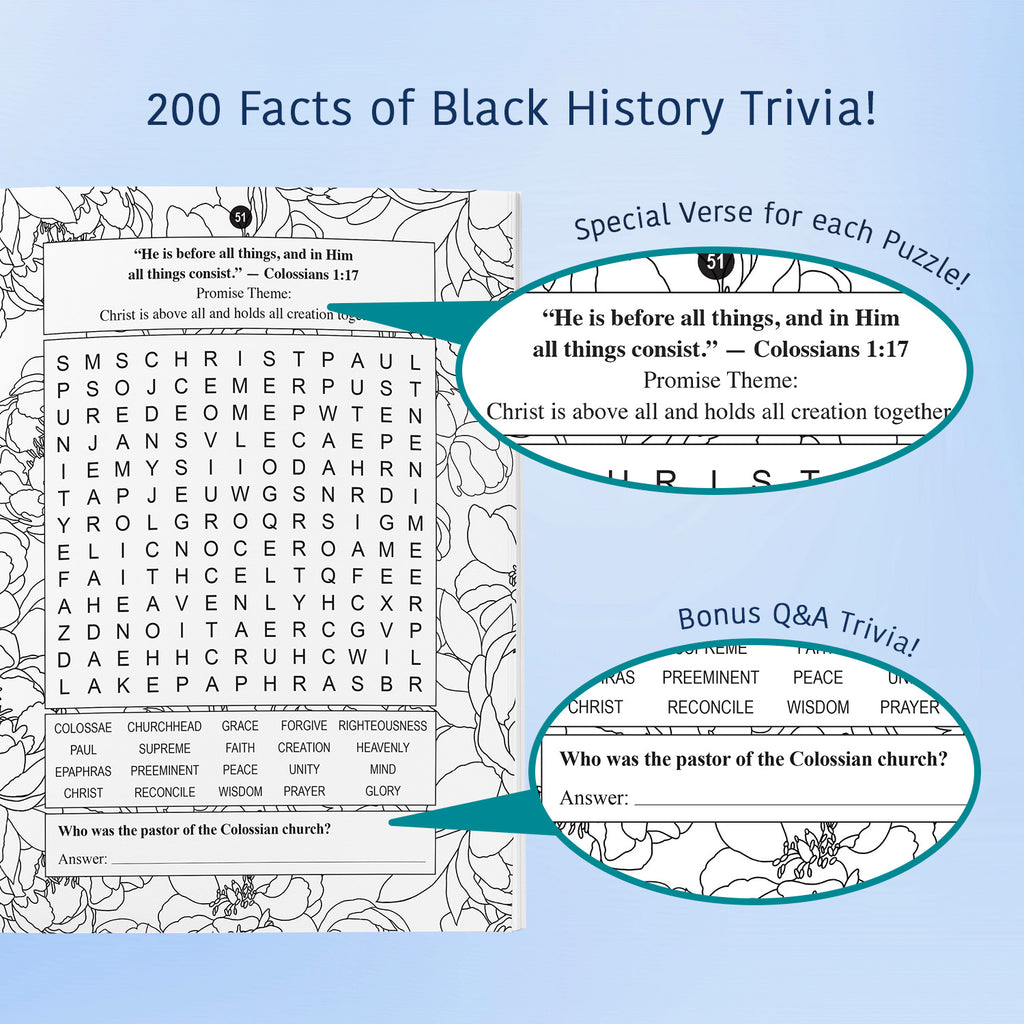 Enjoy over 100 faith-building word search puzzles inspired by key Bible verses and themes. Relax with uplifting coloring pages that encourage creativity and reflection. Test your Bible knowledge with engaging trivia designed to deepen your understanding of God’s Word. Whether you use it for personal devotion, quiet time, or group gatherings, this book offers hours of encouragement, learning, and spiritual refreshment.