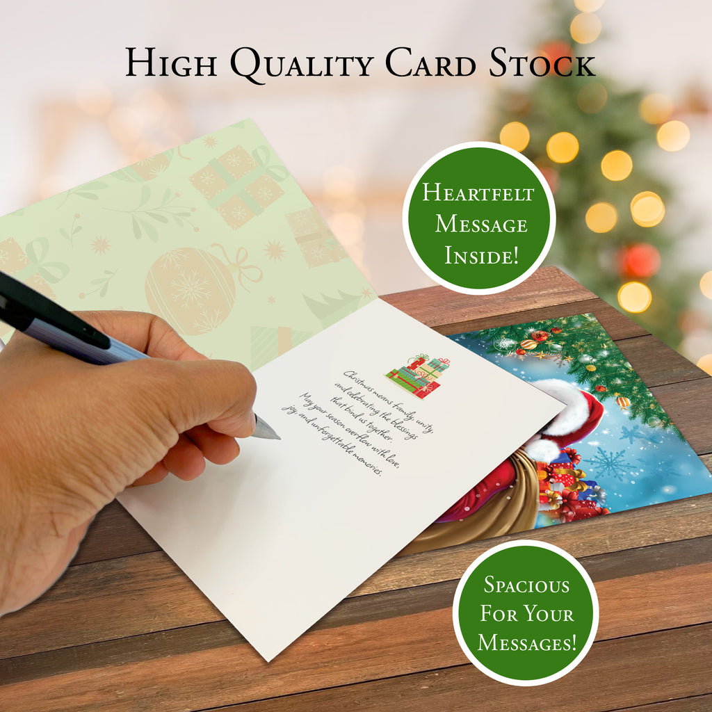 Foil-Stamped Christmas Greeting Cards Box SetAfrican American Expressions Christmas cards celebrate the joy of the holidays and the vibrancy of African-American culture! Our collection of thoughtful seasonal greeting card designs feature faith-inspiring inscriptions and culturally reflective artwork gorgeously embellished with foil-stamping. With over 20 thoughtful designs to choose from, whether timeless, traditional, or modern, you're sure to find the perfect card for everyone on your list!Designed with quality craftsmanship. Every 5 x7" greeting card features a high-resolution image, printed onto sturdy cardstock, and brilliantly embossed. You'll enjoy sharing these elegant and uplifting cards with your loved ones!Holidays, SimplifiedEverything you need to be holiday-ready in one box! AAE's boxed sets include 15 gorgeous greeting cards with coordinating foil-lined envelopes and gold sticker seals. Just personalize, seal, and deliver!FeaturesInspirational Christmas Cards5 x 7"Boxed Set15 Embossed Greeting CardsCoordinating Foil-Lined EnvelopesGold Sticker SealsAbout UsAfrican American Expressions is the world’s largest black-owned gift and greeting-card company. Known for eye-catching designs and poignant art pieces, we offer the top selection of culturally authentic gifts and give back to the community through the AAE fundraising program.